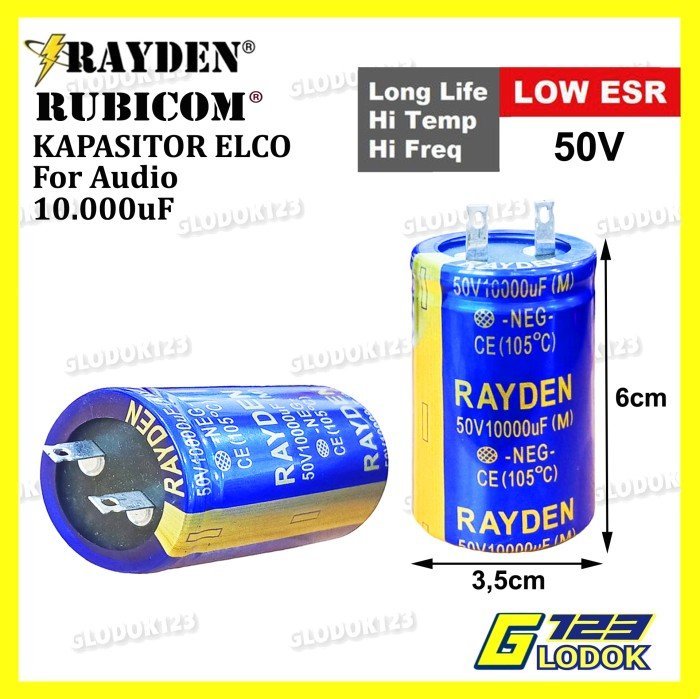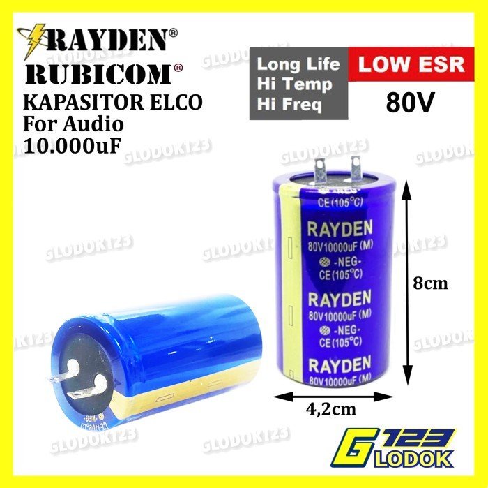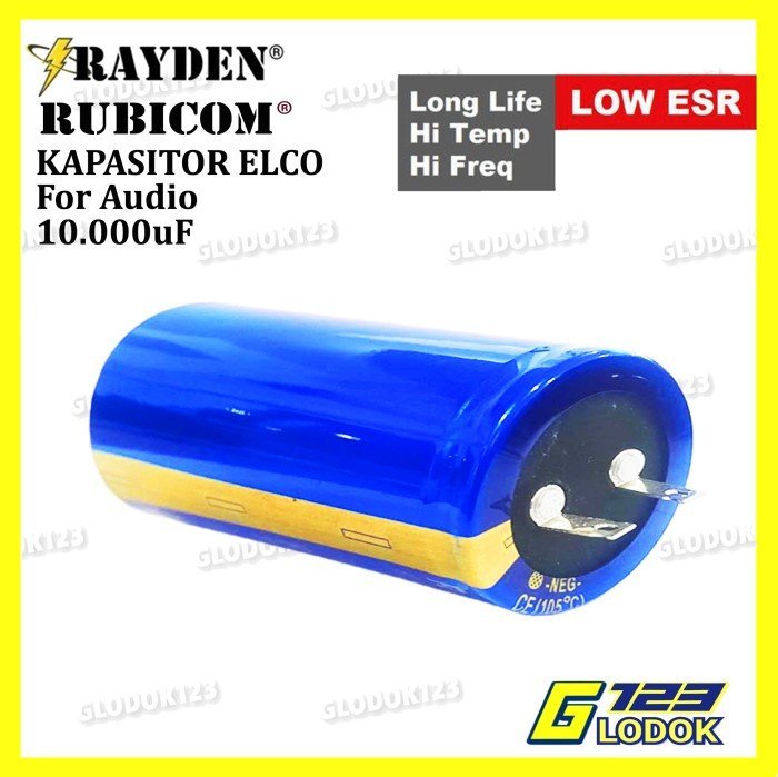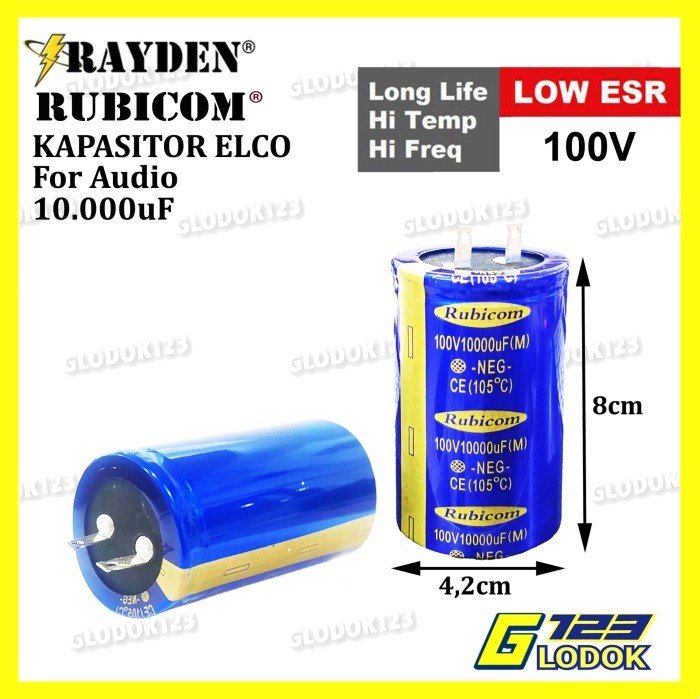 Elco atau kondensator/kapasitor elektrolit yaitu komponen yang mempunyai dua kaki, yakni kaki ( – ) dan kaki ( + ). Fungsi elco juga bisa di sebut sebagai penyimpan arus listrik searah dc. Rangkaian elco biasanya di gunakan dalam rangkaian apa saja, misalnya pada power supply regulator dan rangkaian lainnya Banyak Digunakan pada Speaker, Amplifier, Aki dll Tersedia Ukuran : 1. 50V 10.000uF 1. 80V 10.000uF 2. 100V 10.000uF * Spesifikasi : 1. 50V 10.000uF – Brand Rayden – Model (Model) 50V 10.000uf – Diameter D : 3,5cm – Tinggi (height) : 6cm 2. 80V 10.000uF – Brand Rayden – Model (Model) 80V 10.000uf – Diameter D : 4,2cm – Tinggi (height) : 8cm 3. 100V 10.000uF – Brand Rubicom – Model (Model) 100V 10.000uf – Diameter D : 4,2cm – Tinggi (height) : 8cm