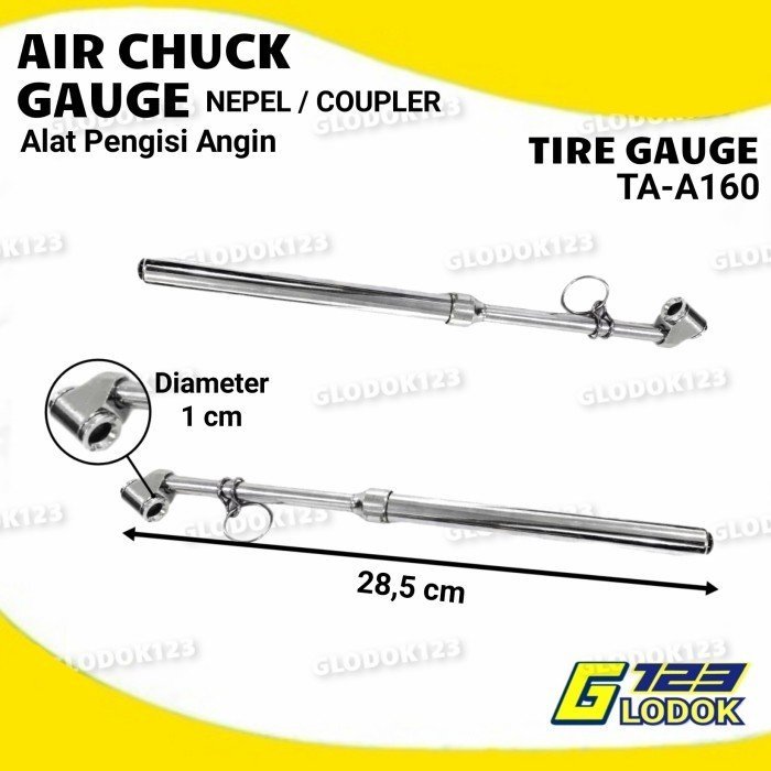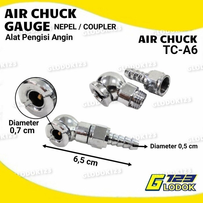 AIR CHUCK GAUGE / ALAT ISI ANGIN Tersedia Type : – Air Chuck TC-A6 – Tire Chuck TC-B6 – Tire Gauge TA-A160 Silahkan untuk memilih varian terlebih dahulu Air Chuck Gauge merupakan alat untuk mengukur tekanan angin pada ban mobil atau motor secara presisi serta membuang tekanan yang berlebih dan mengisi tekanan secara cepat. Alat ini terbuat dari bahan berkualitas yang kuat sehingga awet dan tahan lama dengan panjang 6 inch. Spesifikasi : Material : chrome Dual Head Pump Up Hanging Hole Design Air Inflow Enlarge Untuk ukuran bisa dilihat di gambar
