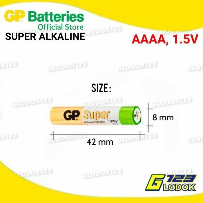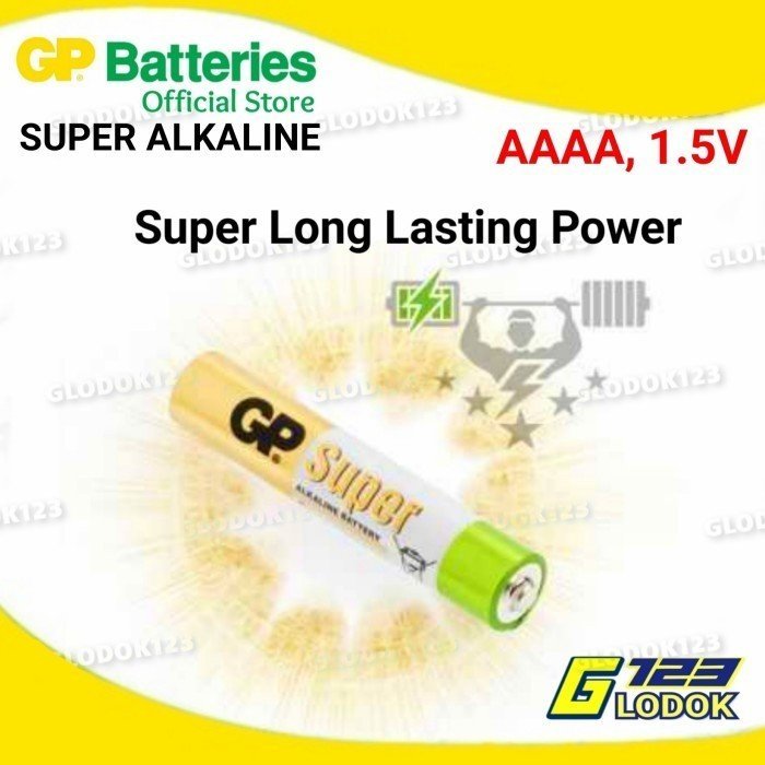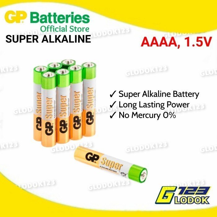 Baterai AAAA (A4) GP super Alkaline Cocok Untuk : StreamLight Stylus, Penlights, Flashlights, Mini flash lights, laser pointers, calculators, electronic games, motor toys, movie cameras, portable tape recorders, portable TV set, Bluetooth headsets, glucose and blood pressure monitors ** Info Produk : – Brand : GP Batteries – Cell size: AAAA/E96/LR61 – Volt: 1.5V – Cell Battery : Alkaline – No Mercury Effect – Long Lasting Power Batteries ** Isi Paket : 1 pack isi 2 Buah Baterai