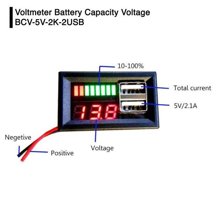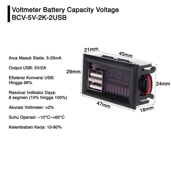 Pantau kondisi daya perangkat Anda dengan Voltmeter dan Indikator Kapasitas Baterai serbaguna ini. Dilengkapi layar LED yang menampilkan tegangan baterai secara akurat (±2%) dan indikator bar 8 segmen untuk kapasitas baterai (10% hingga 100%). Modul ini juga berfungsi sebagai charger dengan dua port USB output 5V/2A, kompatibel untuk pengisian cepat Apple dan Android. Desain ringkas dan efisiensi tinggi (hingga 96%) memastikan pengisian daya optimal dengan panas minimal.