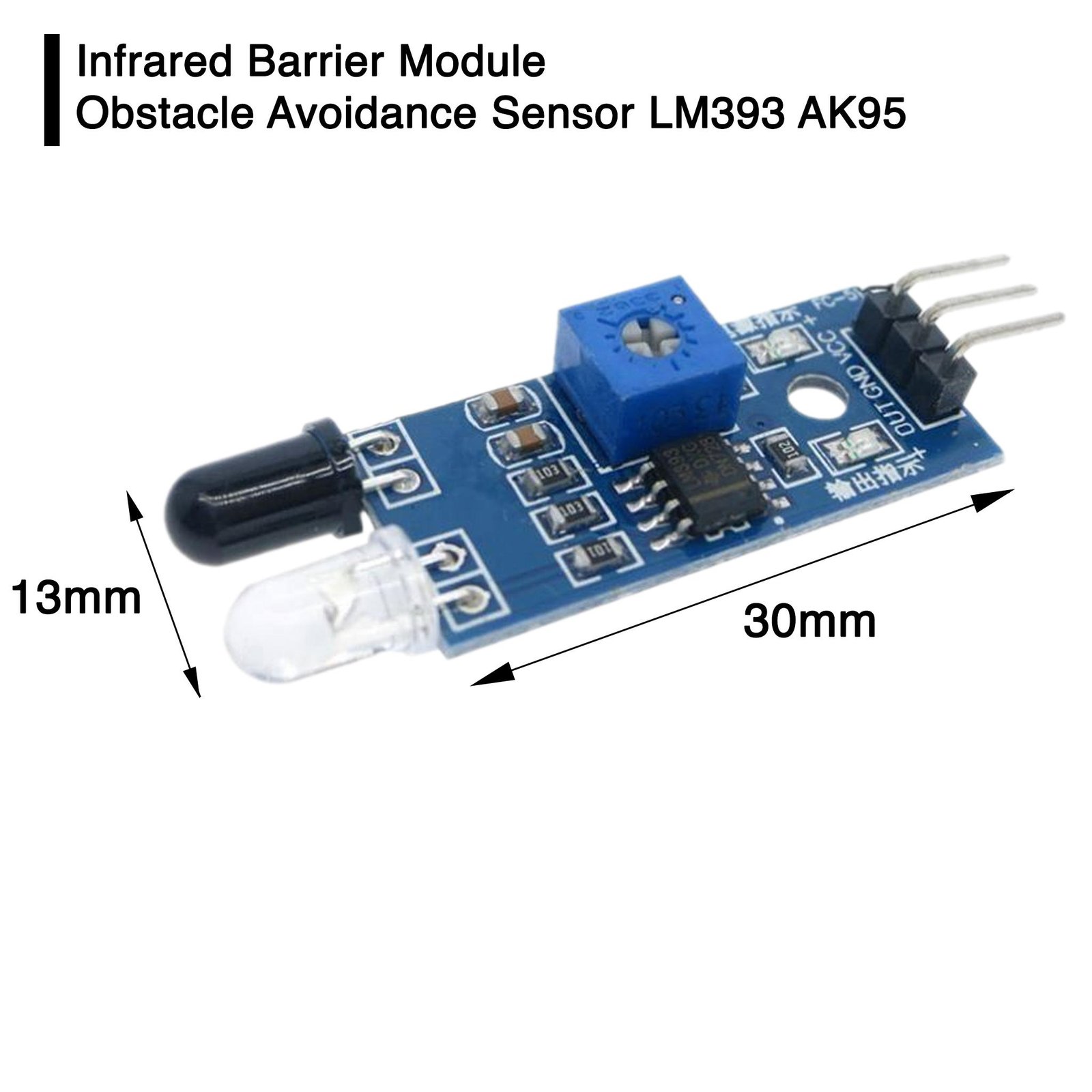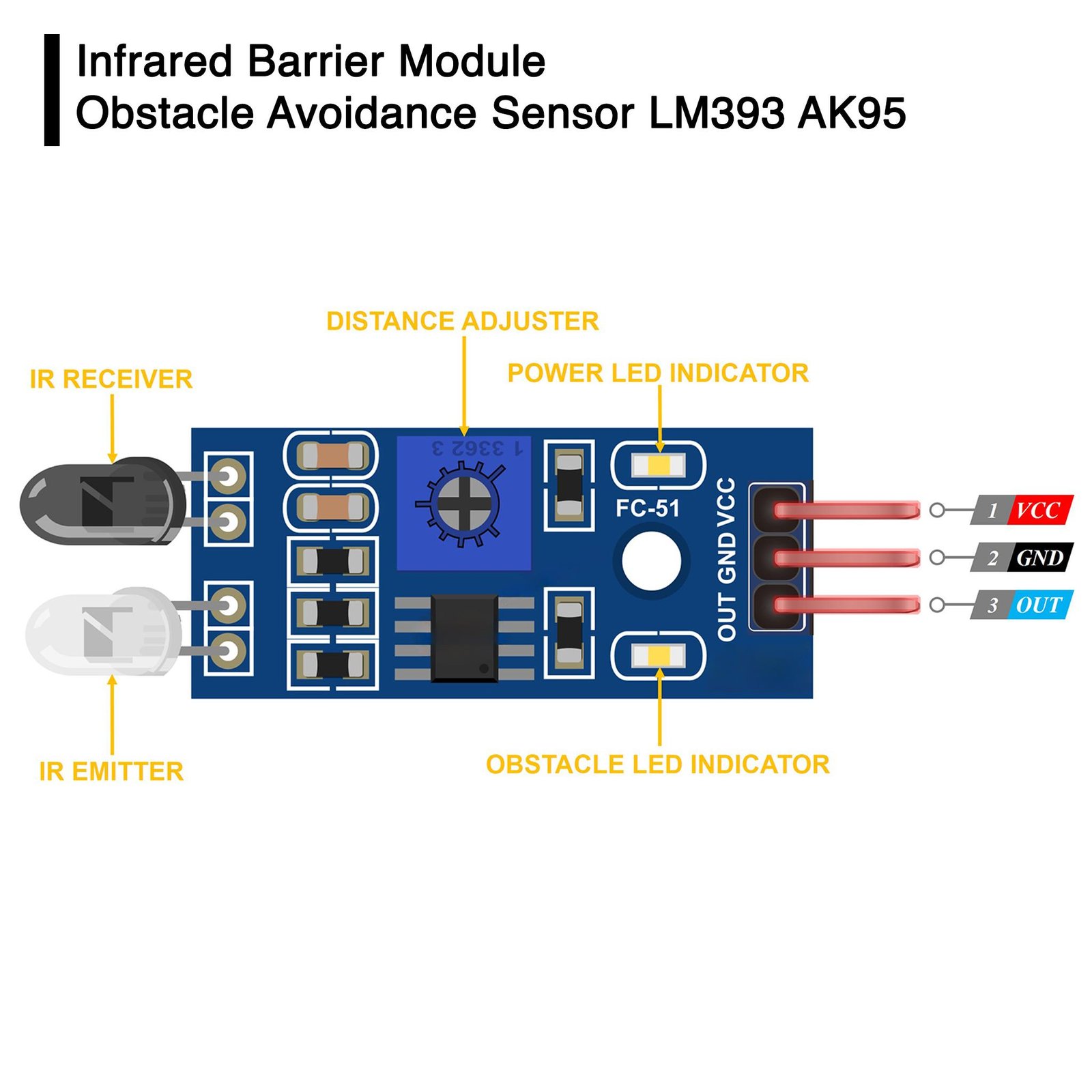 Jarak Deteksi: 2 hingga 60 cm. Jarak ini dapat diatur dengan memutar potensiometer; putar searah jarum jam untuk meningkatkan jarak, dan berlawanan arah jarum jam untuk menguranginya.