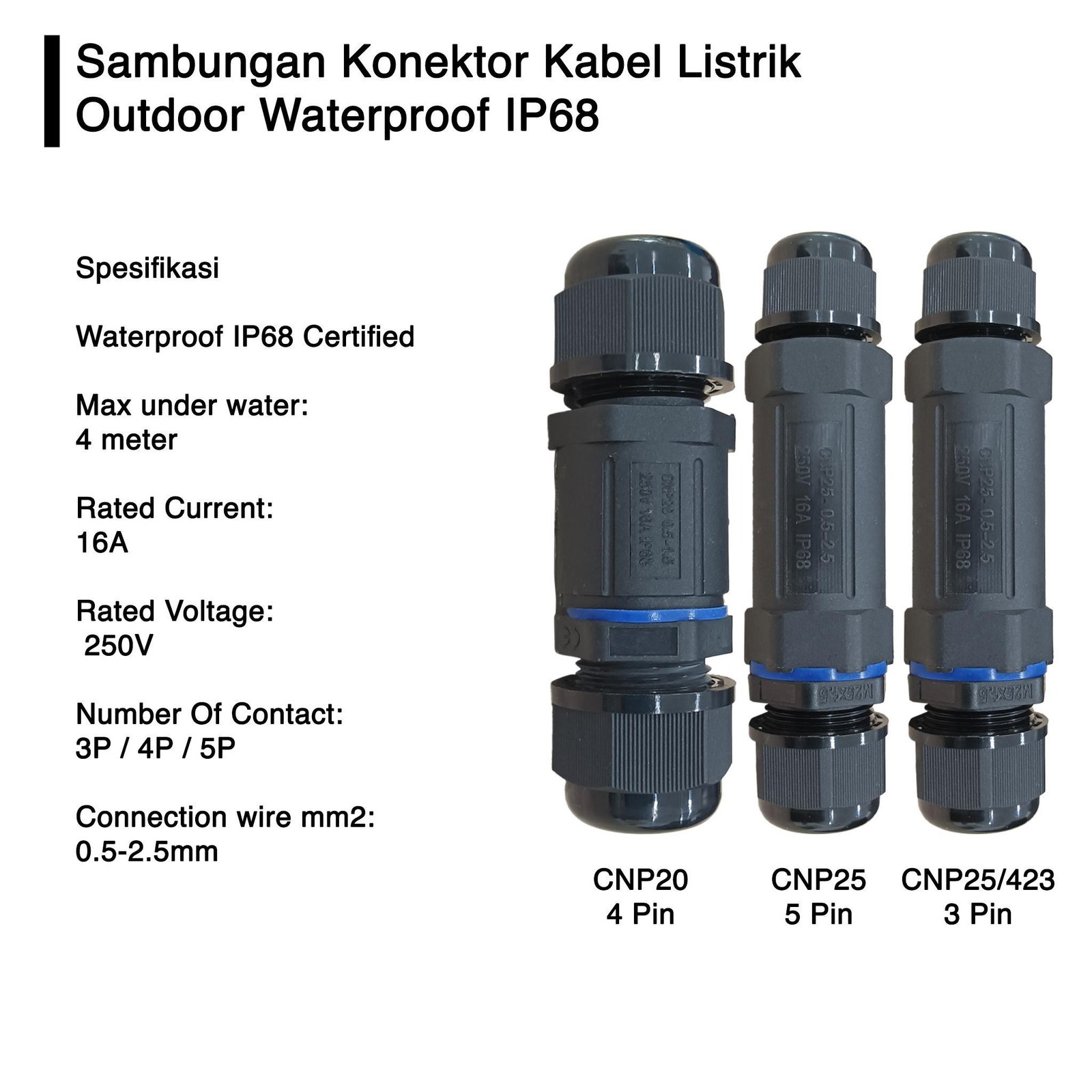 | Ukuran | CNP20 – 4PIN, CNP25 – 5PIN, CNP25-423 3 PIN |