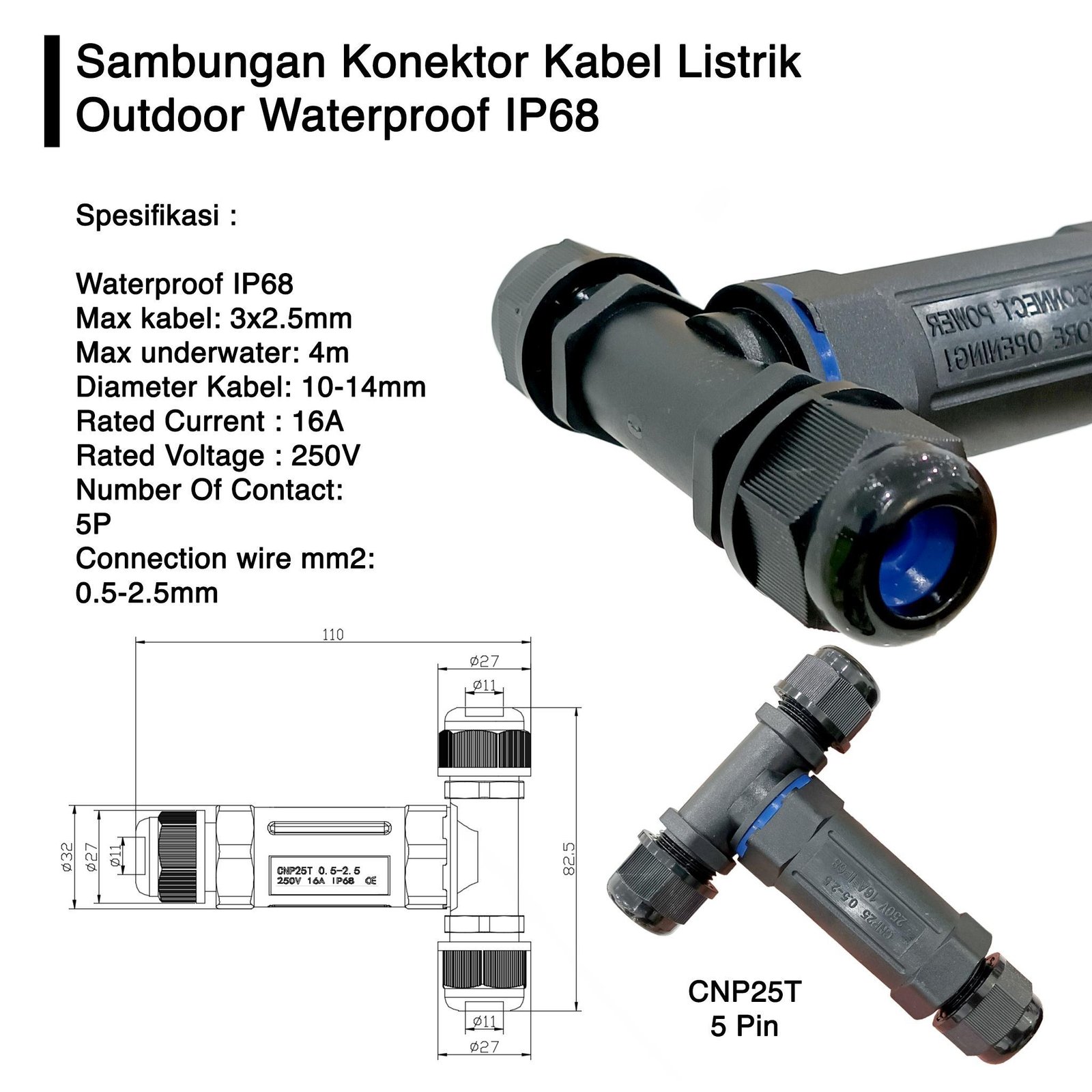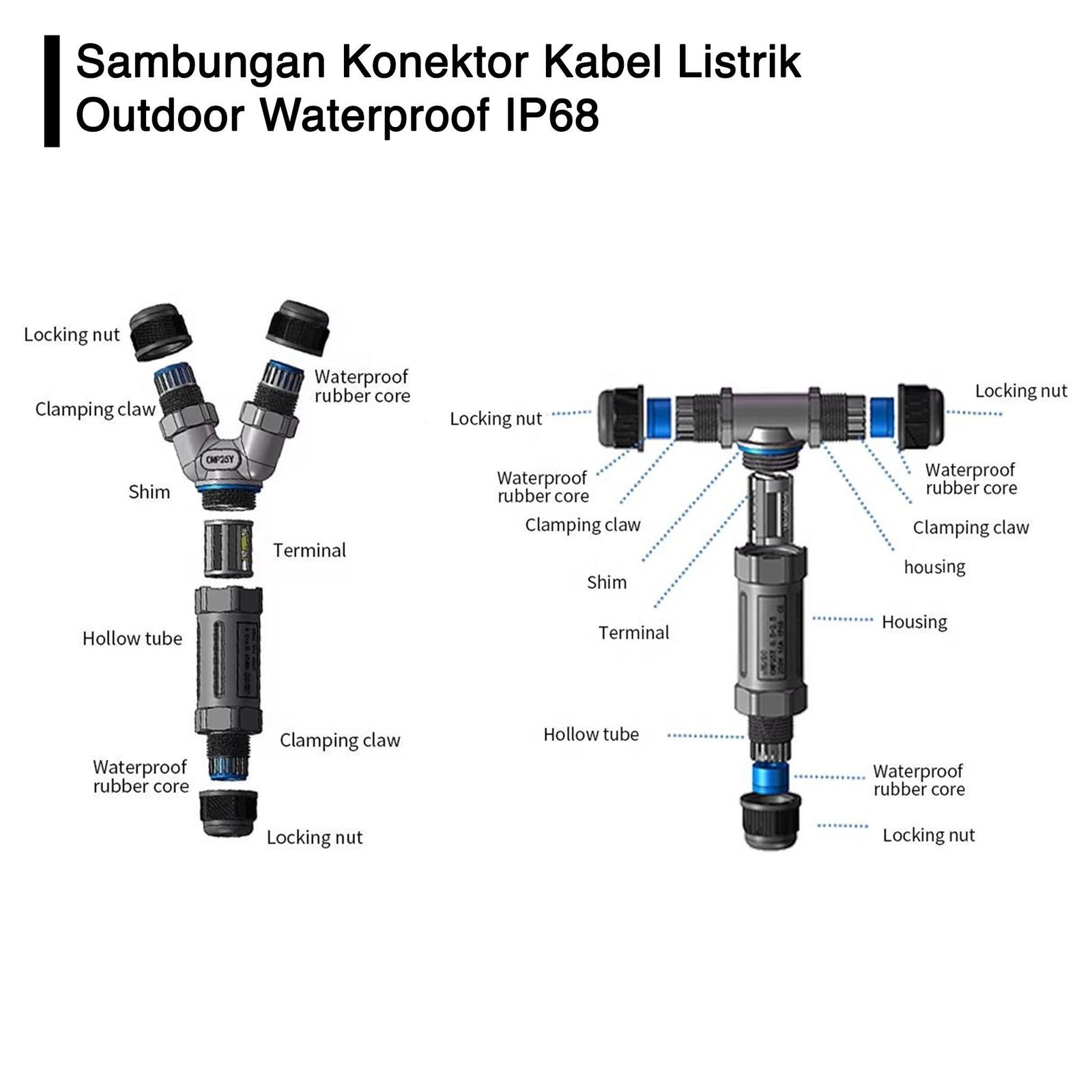 Sambungan Konektor Kabel Listrik Tahan Air Outdoor Waterproof IP68 T Y